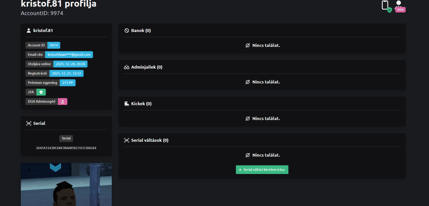 1. Discord Neved: kristof.812. Hogyan szólíthatunk? Kristóf.3. Hány éves vagy? 17.4. Játszott perceid száma? 3 496 Perc / LvL. 8.5. Voltál-e már nagyobb szerveren rendvédelemi szervezet tagja? Igen voltam, de az nem MTA, hanem az MTA copy-ból adódóan jött létre egy SA:MP nevezetű játék platform, ami hasonló az MTA-hoz, csak az MTA kidolgozottabb na és ott kezdtem rendőr karrierem.6. Hány adminjailt, kirúgást, kitiltást kaptál? ((UCP KÉP))7. Mesélj magadról pár mondatban! Kristóf vagyok 17 éves szeretek RP-zni, focizni, sportolni, telefonozni, tanulni, és játszani egyaránt. 2008-ban születtem Székesfehérvár városában, Jelenleg középiskolás vagyok, 9-10. osztályba járok. 11 évesen át estem egy műtéten ami segítette a mozgás korlátozottságomat javítani és még ezzel élem mindennapjaim. Akinek nagyon sokat köszönhetek az életem során az az anyukám és a mamám meg még a Budapesti Semmelweis Egyetem ők hárman segítették az életem és a lábam javulását. Nagyon könnyedén barátkozok akár idegenekkel is. Ugye 9-10. osztályos vagyok Budapesten járok suliba. Szeretek RP-zni és lassan 1-1,5 éve, hogy elkezdtem SA:MP-on RP-zni. Ez a 17.-dik életév egy nagyon nagy mérföldkő az életemben ugyan is már csak 1 év és 18 éves leszek, (néha még az óvodába vágyók vissza amikor fárasztó a suli). Szeretek XBOX-zni is és még sok mást.8. 3-3 Pozitív és negatív tulajdonság! Pozitív: Segítőkész vagyok, barátságos vagyok, kedves vagyok. Negatív: Túlgondolok dolgokat, domináns vagyok, általában nehezen kérek segítséget.Személyes Információk