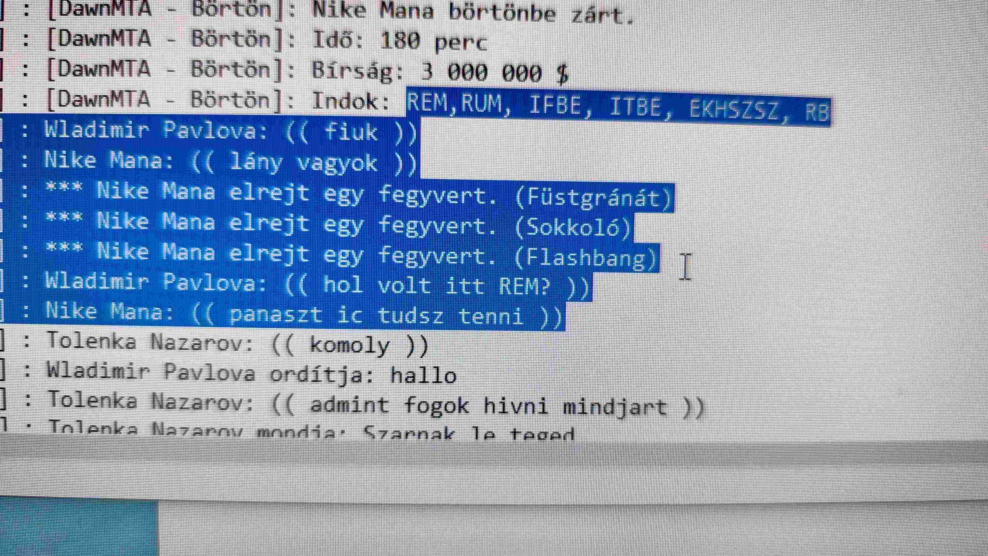 Megjegyzés:Ooc megkerdeztem hogy mitt tudok vele kezdeni mert olyanert vagyok meg mindig boribe amit el sem kovettem.Azt irta hogy ic tudok panaszt tenni.Igen csak abban a pillanatba hogy leirta elszaladt es meg eselyem sem volt panaszt tenni.Es meg ovadekra sem volt lehetoseg.3-an voltunk a sracokal veluk ugyan ez tortent.Roviden annyi hogy rabolni voltunk es elmentunk valatani pont jott egy masik banda es egy kis ido utan az NNI 2 tarsam kocsiban ragadt nem tudtak kiszalni valami bug miatt sajnos nincs rola bizonyitek ezrt megrtem hogy ervenytelen.Meg a fegyvert sem vetuk elo.En nem sokat lattam mert eppen valtotam es a kamera szemszog nem arra nezett, miutan befejztem egybol sokolo es megkototek.Sracok pedig a kocsiban ultek mert nem tudtak kiszalni.Bevittek boribe tetek.Indok:REM RUM IFBE ITBE EKHSZSZ RB. Meg csak 1 szot szem valtotunk veluk.(Tolenka Nazarov,Tolenka Andrej es en,Dc-jobban eltudom magyarazni a tortenteket.Akar logot is tudok mutatni.)