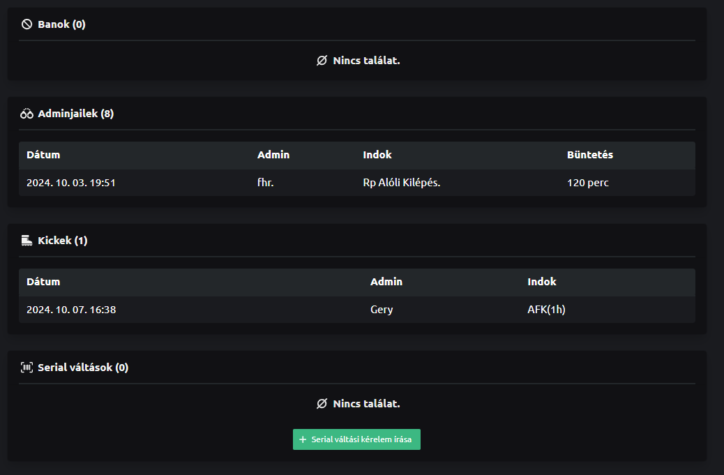 1. Discord neved: csizivokbaz692. Hogyan szólíthatunk? Csizi3. Hány éves vagy? 164. Játtszott perceid száma? 5 801 perc5. Voltál-e már nagyobb szerveren rendvédelemi szervezet tagja? seemta navos 1 hétig mert más lett a leader de semmit nem tanitotak csak azt hogyjárörözek6. Hány adminjailt, kirúgást, kitiltást kaptál? ((UCP KÉP))7. Mesélj magadról pár mondatban. Nyugodt türelmes embernek tartom magam szeretek csapatban dolgozni8. 3-3 Pozitív és negatív tulajdonság megbízható, segítőkész, jó problémamegoldó Negativ:néha túlzottan maximalista, makacs, néha túl sokat vállalokÁltalános adatok