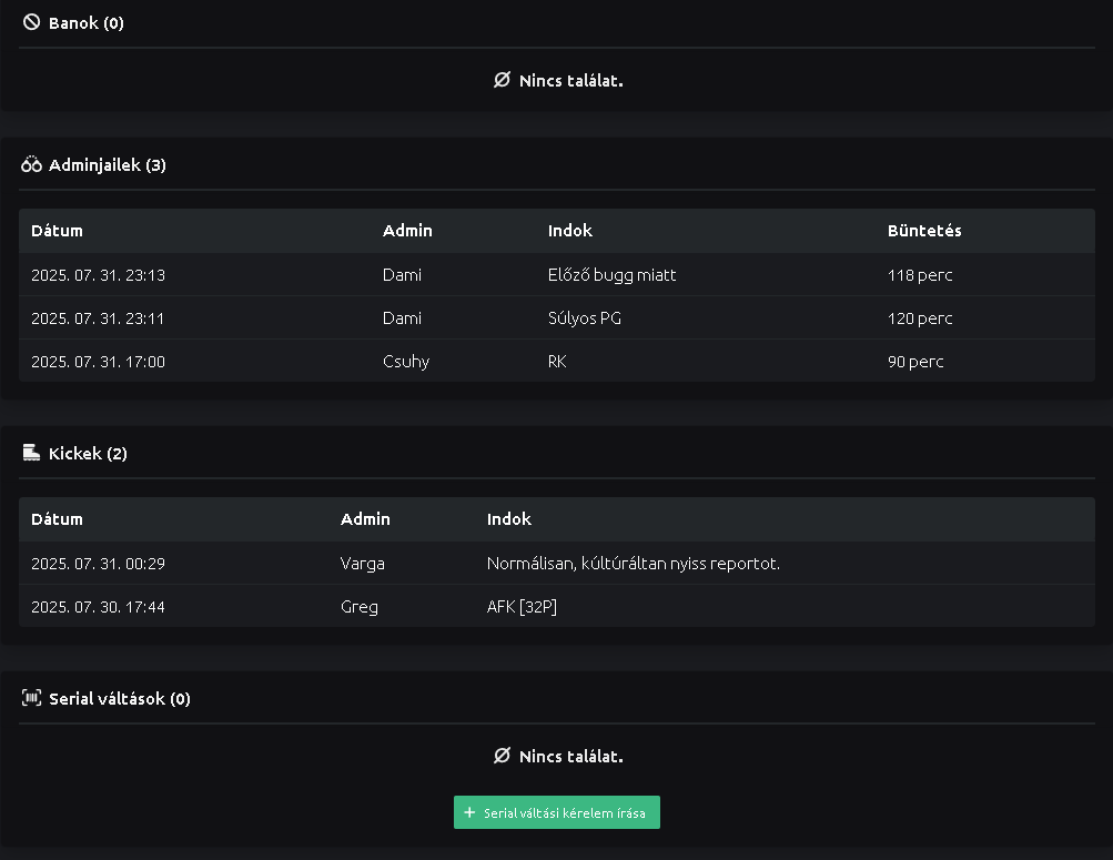 Adminisztrátorként az időmet elsősorban az jatekosok kereseire/kerdeseire, gyors és hatékony megoldasara plusz segitenek minden egyes admin tarsamnak aki meger ra vagy latom hogy raszorul.